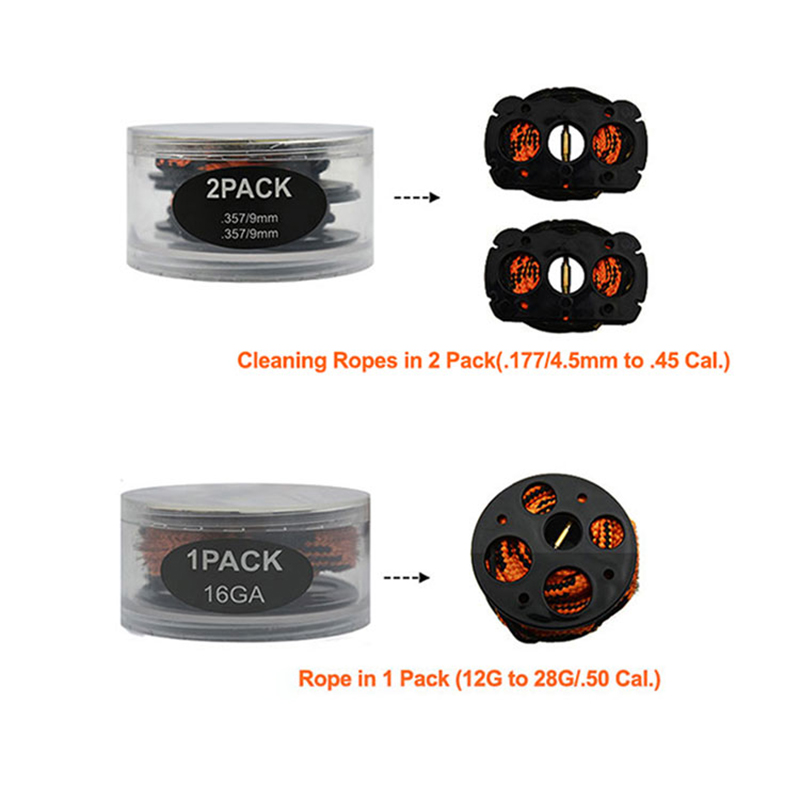 ● Мылтық тазартқыш арқандар тығыз тігіледі, оңай бұзылмайды; Селитетикалық талшықты арқан щеткамен салынған щеткамен оралған щетканы тез және тиімді тазартады. Калибрлі нөмір - бұл әр ұшу гайкасында басылған лазер. Арқандар қайта пайдалану үшін жууға болады.