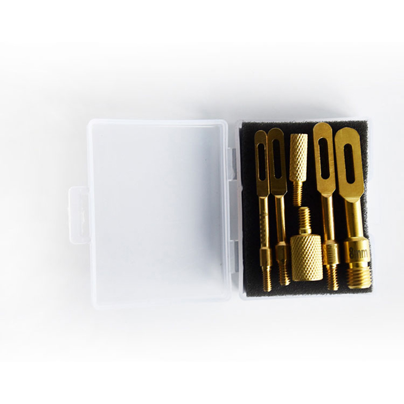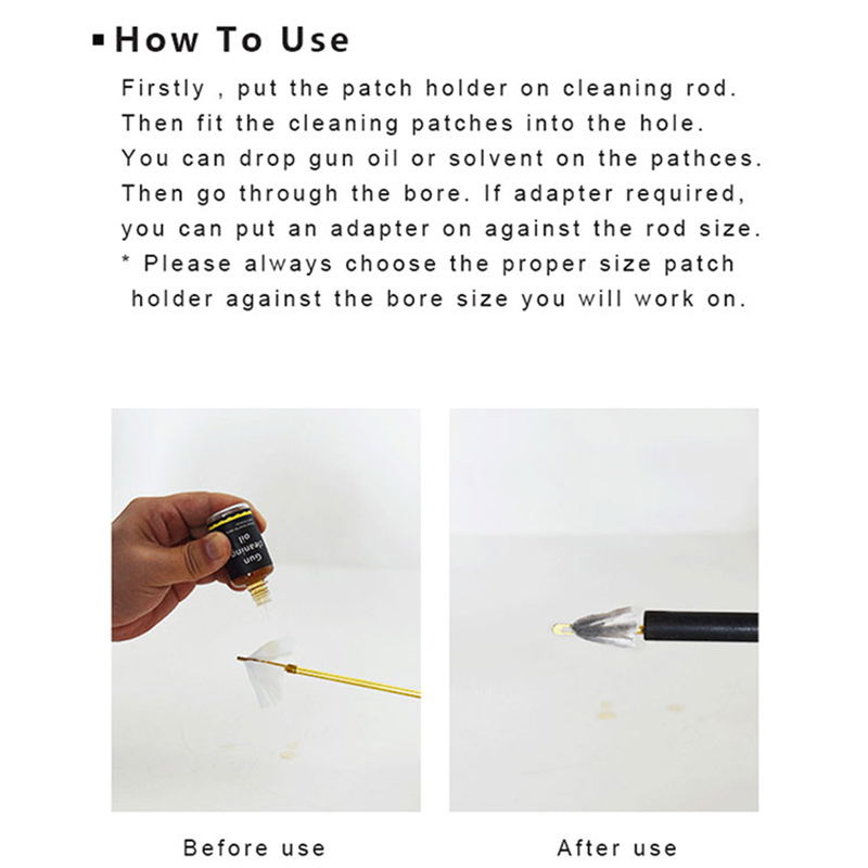 6 Поштаның тазалығы Патшаны тазалау Патч ұстағыштар / саңылаулар мен ілмектер Қосылған адаптерлер бір шағын қорапқа оралған, барлық калибрлерге арналған мылтық мылтықтары үшін әмбебап мылтық тазартқыш жинақ. Екі адаптер оларды әр түрлі бұрандалы жаңғақтардағы тазалағыштарды тазартуға мүмкіндік береді. Тазалағыштарды саңылаулы тесік арқылы салыңыз, борандарды тазарту үшін еріткіш немесе мылтық майын салыңыз.