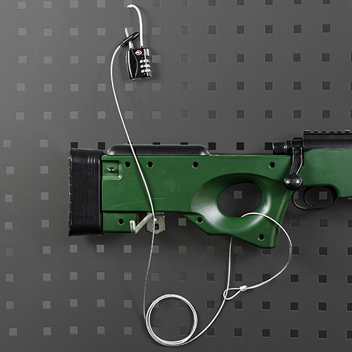 1, бір ұшы сөреге бекітілген ілмек, екінші ұшы сандық құлыппен бекітіледі. 2, Ұзын кабельді ұрланбай оңай көрсету үшін бірнеше мылтықты немесе бір мылтықты құлыптау үшін пайдалануға болады. 3, сандық құлып қауіпсіз және кілтті жоғалту туралы алаңдамаудың қажеті жоқ. 4, сұр кабель мылтық дисплейіне көзбен әсер етпейді, ал ішкі болат сым арқан абсолютті қауіпсіздік. 5, Дөңгелек қорап және оның ішкі орама сөресі сақтауға және тасымалдауға ыңғайлы.