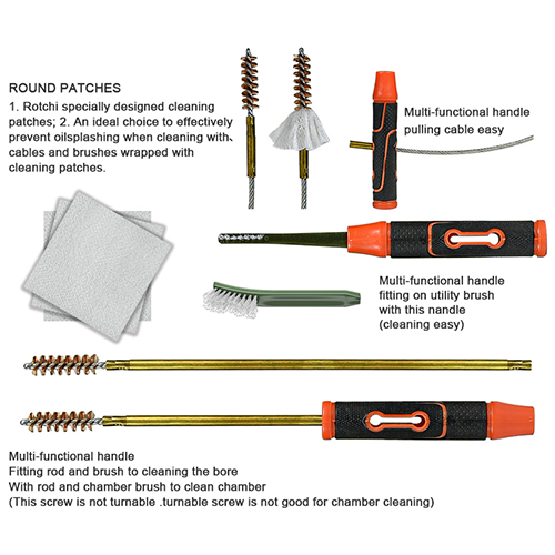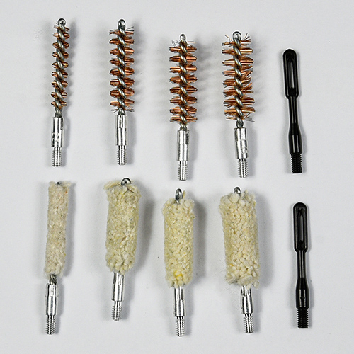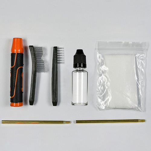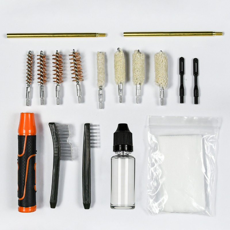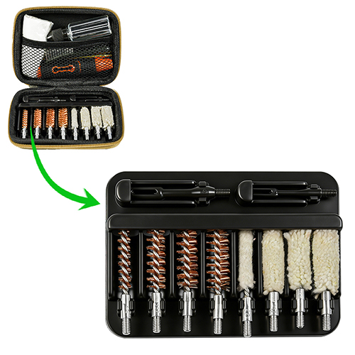 Мылтық тазалау жинағы 4 өлшемді қамтиды (.22, 9мм, .40, .45кал.). OX матамен қапталған Сыдырмасы бар ПВХ қорап. Жезден жасалған щеткалар мен мақта сүрткіштер, 2 шыбық. Құм және қара таңдау үшін түс.