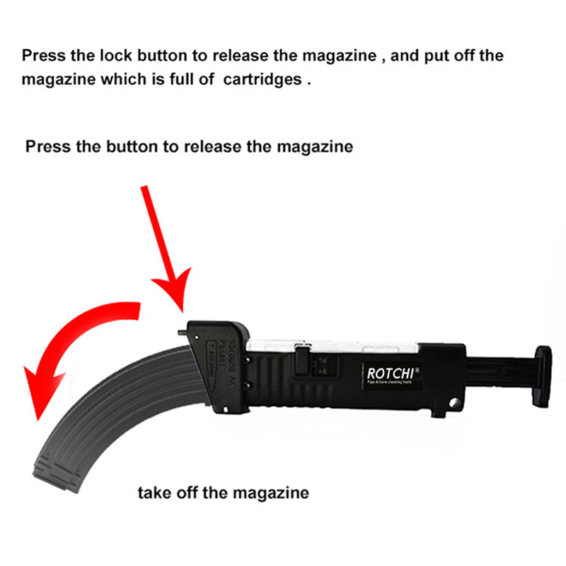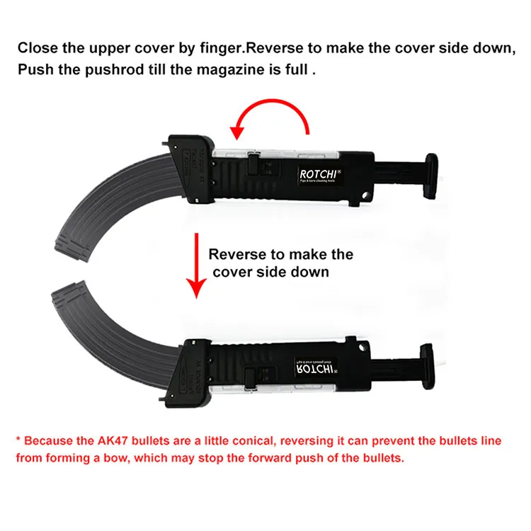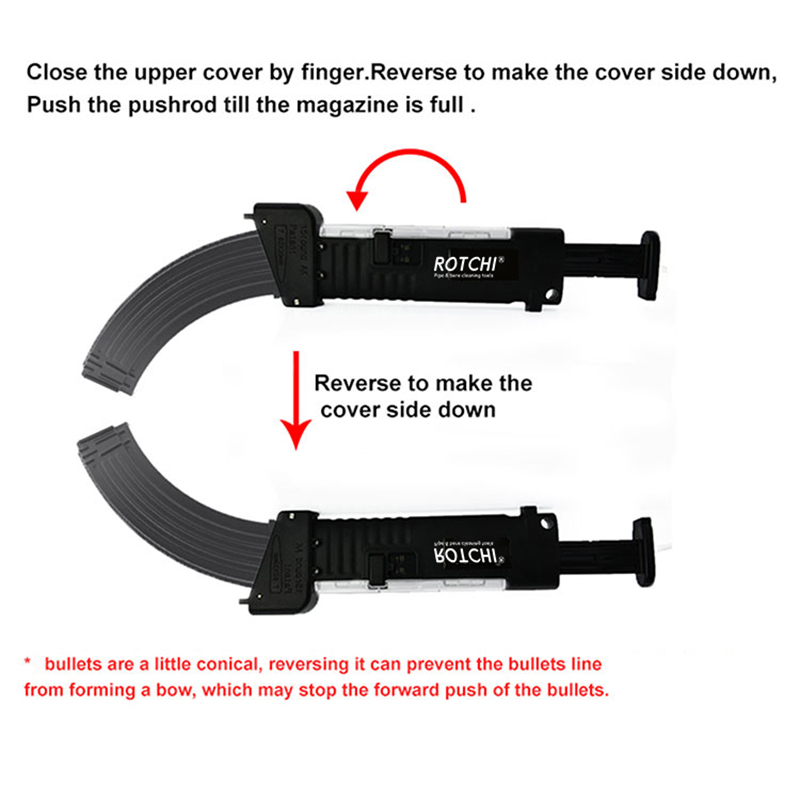 AK47 үшін Журнал жылдамдық тиегіш ● 7.62x39mmm картридждерін AK журналына сыйымдылығы 10/20/30 немесе одан да көп жүктеу үшін пайдаланылады. ● Картридждерді толтырып, ойыққа толтырыңыз, журналды AK механикалық қағидаттарға ұқсас етіп орнатыңыз. Итергішті итеріңіз, картридждер журналға оңай кіреді. ● Оңай жұмыс, қыз өте тез жасай алады. ● Күшті дене. Картридждерді жүк тиегіш ішінен Ransarant қақпағы арқылы көре аласыз. Құлыптау қақпақты сақтау кезінде ашпаңыз. ● Картридждерді журналдан түсіре алмаған кезде түсіруге болады, бірақ журнал әлі де толады.