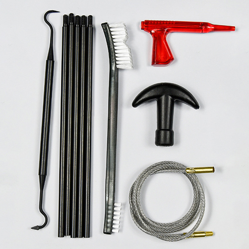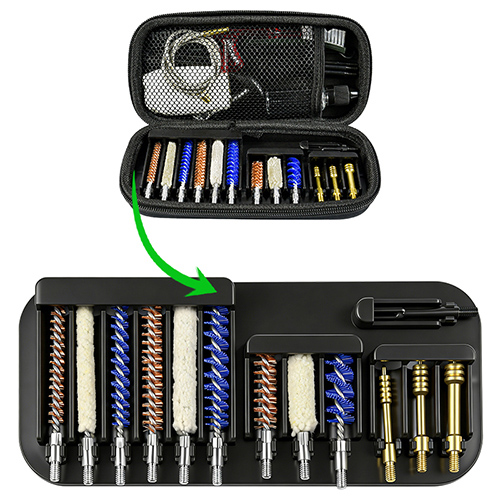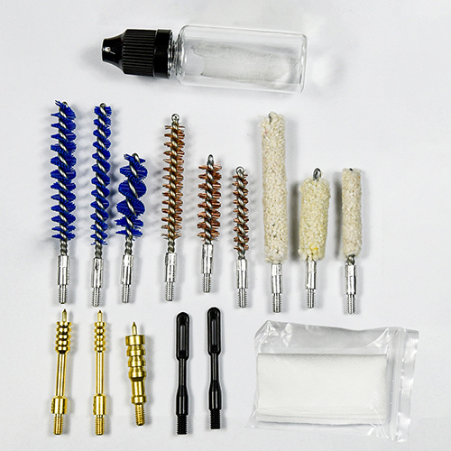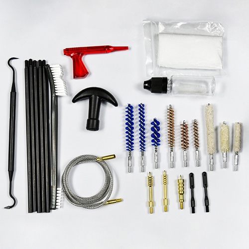Мылтық пен тапаншаны тазалау жинағы 3 өлшемді қамтиды ( .22кал. .30кал. 9мм). OX матасы сыдырмасы бар ПВХ қапталған қорап. Жезден жасалған щеткалар, мақта сүрткіштер, нейлон щеткалар, жезден жасалған тістер, 5 штанга 1 калб. Таңдау үшін құм және қара түсті.